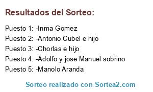 Lista de participantes: -Jorge Borrego, -Santi Estepa, -Manuel M. Pozo, -Adrián Pozo, -Daniel Pozo, -Gancho, -Inma Gomez, -Jose Alejandro Moriana, -Adolfo y jose Manuel sobrino, -Pepe Vitorino y Nieta, -Manolo Aranda, -Antonio Cubel e hijo, -Chorlas e hijo.