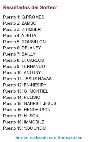 Lista de participantes: Y.BOUNOU, HENDERSON, G. MONTIEL, A.BUTA, JESUS NAVAS, ROUSILLON, BAILLY, D. CARLOS, J.TIMBER, FERNANDO, DELANEY, ZAMBO, PULISIC, Q.PROMES, H. SON, ANTONY, EN-NESIRY, IMMOBILE, GABRIEL JESUS.