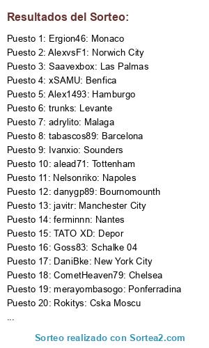Lista de participantes: Adriantr127: Atco. de Madrid, adrylito: Malaga, alead71: Tottenham, alemalaga94: Bayern Munich, Alex1493: Hamburgo, alexfcbarcelona: Borussia Dortmund, AlexvsF1: Norwich City, AndrewTorres: Real Sociedad, Balles: Malmoe, benniscuba: As Roma, buijin: Celtic, CometHeaven79: Chelsea, cudeiro: Ath. Bilbao, Dakarri: B. Moenchegladbad, DaniBke: New York City, danygp89: Bournomounth, davidrikoone: Sp. Lisboa, El8Pelocho: Lugo, Ergion46: Monaco, ferminnn: Nantes, Goss83: Schalke 04, haankko888: Los Angeles Galaxy, HaLiToxGCFx: Granada, Havel7: Psg, iGosling v9: Arsenal, Ivanxio: Sounders, javitr: Manchester City, josegomisortega: Aston Villa, KaOs I AsTuR: Oviedo, lorenbb: Ol. Marsella, Luispro0103: River Plate, merayombasogo: Ponferradina, misterserpico: West Ham, Mori1983: Fiorentina, MrMohamRam: Liverpool, n0jan: Cristal Palace, NandoBel78: Real Madrid, Nelsonriko: Napoles, pececillo1977: Ajax, perikinho90: Cordoba, pinolines: Sevilla, Platero17: Oporto, Red Dutti: Bayer Leverkusen, Rokitys: Cska Moscu, Saavexbox: Las Palmas, Semmenup: Orlando City, sergiord14: Wolfsburgo, sergiotabascos89: Manchester United, SpiffiestJose: Ol. Lyon, SrPistolas86: Udinese, StormFury: Elche, susa16: Alaves, tabascos89: Barcelona, TATO XD: Depor, TheForceMaker: Alcorcon, toni1708: Celta, trunks: Levante, ulimoreno: Juventus, victub: Valencia, Viya88: Rayo Vallecano, x chachiquesi x: Betis, xSAMU: Benfica, Yelko100: Everton, zzzz jona zzzz: Boca.