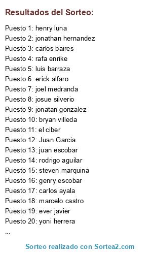 Lista de participantes: juan escobar, kevin benitez, luis barraza, roberto escobar, jonatan gonzalez, carlos artiga, josue silverio, marcelo castro, ever javier, steven flores, rafa enrike, jonathan hernandez, erick alfaro, henry luna, joel medranda, genry escobar, bryan villeda, steven marquina, rodrigo aguilar, cristian guzman, carlos ayala, carlos baires, Juan Garcia, el ciber, yoni herrera.
