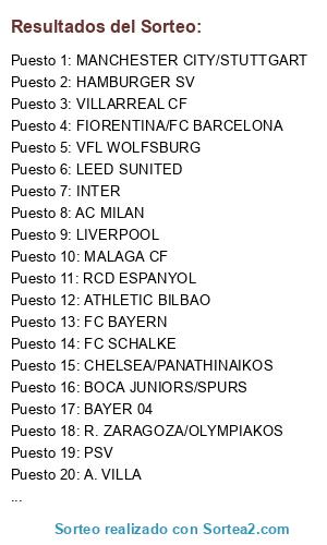Lista de participantes: ATHLETIC BILBAO, LEED SUNITED, WERDER BREMEN, SL BENFICA, SEVILLA FC, BOCA JUNIORS/SPURS, MANCHESTER CITY/STUTTGART, REAL MADRID, VALENCIA CF, AC MILAN, CHELSEA/PANATHINAIKOS, FC SCHALKE, AJAX, R. ZARAGOZA/OLYMPIAKOS, ARSENAL/SPORTING CP, GETAFE CF, MALAGA CF, VFL WOLFSBURG, LIVERPOOL, BAYER 04, RCD ESPANYOL, SUNDERLAND, NAPOLI, PSV, INTER, A. VILLA, AS ROMA/ATLETICO MADRID, VILLARREAL CF, FIORENTINA/FC BARCELONA, NEWCASTLE UTD, FC BAYERN, HAMBURGER SV.