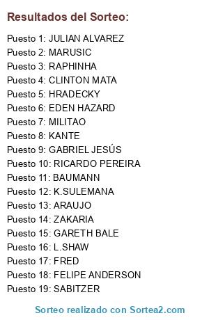 Lista de participantes: HRADECKY, BAUMANN, MILITAO, ARAUJO, RICARDO PEREIRA, L.SHAW, CLINTON MATA, MARUSIC, KANTE, RAPHINHA, ZAKARIA, SABITZER, FRED, K.SULEMANA, GABRIEL JESÚS, EDEN HAZARD, JULIAN ALVAREZ, FELIPE ANDERSON, GARETH BALE.