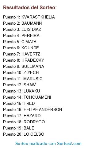 Lista de participantes: BAUMANN, HRADECKY, MARUSIC, PEREIRA, C.MATA, KOUNDE, SHAW, TCHOUAMENI, FRED, HAVERTZ, LO CELSO, LUKAKU, LUIS DIAZ, RODRYGO, SULEMANA, BALE, KVARASTKHELIA, FELIPE ANDERSON, HAZARD, ZIYECH.