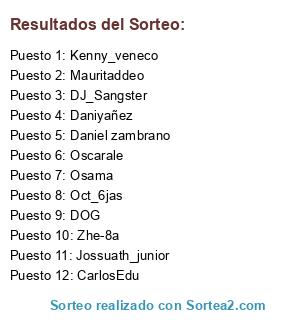 Lista de participantes: CarlosEdu, Daniel zambrano, Daniyañez, DJ_Sangster, DOG, Jossuath_junior, Kenny_veneco, Mauritaddeo, Oct_6jas, Osama, Oscarale, Zhe-8a.
