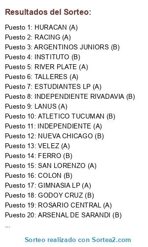 Lista de participantes: ALL BOYS (B), ARGENTINOS JUNIORS (B), ARSENAL DE SARANDI (B), ATLETICO PARANA (B), ATLETICO TUCUMAN (B), BANFIELD (A), BELGRANO (A), BOCA JUNIORS (A), CHACARITA (B), COLON (B), ESTUDIANTES LP (A), FERRO (B), GIMNASIA LP (A), GODOY CRUZ (B), HURACAN (A), INDEPENDIENTE (A), INDEPENDIENTE RIVADAVIA (B), INSTITUTO (B), LANUS (A), NEWELL'S OLD BOYS (A), NUEVA CHICAGO (B), PATRONATO (B), RACING (A), RIVER PLATE (A), ROSARIO CENTRAL (A), SAN LORENZO (A), SAN MARTIN DE TUCUMAN (B), TALLERES (A), UNION (B), VELEZ (A).