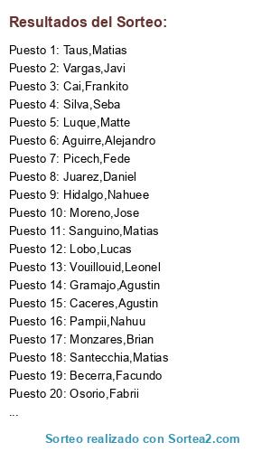 Lista de participantes: Aguirre,Alejandro, Agustin,Mariano, Agustin,Mauro, Albornoz,Franco, Becerra,Facundo, Caceres,Agustin, Cai,Frankito, Carp,Cristian, Dieser,Juan, Gramajo,Agustin, Grillo,Walter, Hidalgo,Nahuee, Juarez,Daniel, Lerzo,Joel, Lezcano,Aguus, Lobo,Lucas, Luque,Matte, Monzares,Brian, Moreno,Jose, Osorio,Fabrii, Pampii,Nahuu, Pes,Frankito, Picech,Fede, Rivero,Yannick, Sanguino,Matias, Santecchia,Matias, Silva,Seba, Taus,Matias, Vargas,Javi, Vouillouid,Leonel.