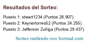 Lista de participantes: Jefferson Zuñiga (Puntos 29.437), stwart1234 (Puntos 28.907), Keynertorres52 (Puntos 24.255).