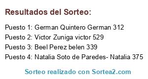 Lista de participantes: Gaby Yañez Gabriela 137, Meel Fleitas Melisa 323, Maryna Bar Marina 961, Alee Paillan Alejandro 396, Noelia Dalmau Noelia 472, Yiyo Yiyo anahi 452, Maryna Bar Guillermo 756, German Quintero German 312, Marce Juarez Omar Antileo, Flor Coraita Florencia 821, Aldo David Legüe Aldo Legüe 341, Karen Duran Karen 540, SolSol Aciar soledad 262, Perro Punk patricio 544!!, Nelly Paz Nelly 588, Matias Ricotero Matias 765, Diego Ramones diego 216, Antonella Leffitrip antonella 976, Pamela Chu Pamela 514, Matiaas Sandoval Mattiaas 265, Carlos E. Barros Carlos 535, Juank Beloqui juan 314, Analia Mulatti ana 893, Gaby Flores Gabriela 543, Beel Perez belen 339, Laura Puertas Laura 114, Francorock Cajn franco 562, Ale Limon alejandra 591, Gelatina Infractora choli 877, Cristian Nicolas Navarrete Cristian 426, Chelo Cajn Marcelo 128, Yesi N Furter Yesica 932, Julián Marsh Julian 199, Alessandro Garotto Vera Oszika Alessandro 315, Natahiel Garcés Natahiel 589, Micaela Fullana Micaela 279, Gabitta Silvana Gabriela 384, Alejandro Rivas Alejandro 369, Roxana Vargas Roxana 323, Facundo Rodriguez Facundo 892, Adriana Olmos Anchordoqui Adriana 991, Lalo Landa Matias 888., Dalma Zárate Dana 906, Clau Flores Claudia 770, Flor Navarro 383, Axeel Doyle axel 898, Gustavo Nicolas Paredes gustavo 258, Robert Smith Roberto 138, Pailla Marcos Marcos 475, Flor Maia florencia 760, Lidia Alaniz lidia 045, Brian Tafra Brian 716, Cynthiia Vidal Cinthia 192 , Jessi Bell Jessica 535, Rocio Márquez Rocio 596, Mauro Rojas Mauro 903, Damian Ibanosqui Damian 241, Ramiro Diaz Ramiro 076, Victor Zuniga victor 529, Natalia Soto de Paredes- Natalia 375, Sil Ramone Silvina 927, Vanesa Gallardo Vanesa 288, Rocio Duran Rocio 207, Marce Juarez Marcela 380.