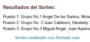 Lista de participantes: Grupo No.1 Angel De los Santos, Miriam Disla, David Turbi y Jaime Martinez, Grupo No. 2 Joan Calderon, Handerly Salvador, Tirso Salcedo y Carlos Perez, Grupo No.3 Miguel Angel, Juan Aquino, Dionildo Caceres y Daniel Perez.