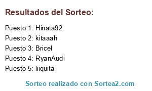 Lista de participantes: liiquita(2 participaciones), Hinata92(12 participaciones), kitaaah(7 participaciones), RyanAudi(10 participaciones), Bricel(6 participaciones).