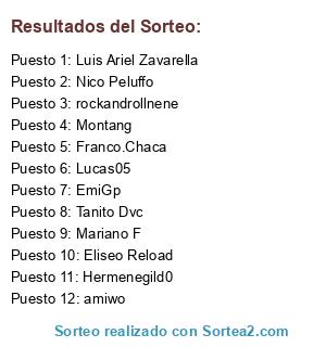 Lista de participantes: Franco.Chaca, rockandrollnene, Lucas05, Hermenegild0, amiwo, Nico Peluffo, Tanito Dvc, Mariano F, Eliseo Reload, Luis Ariel Zavarella, Montang, EmiGp.