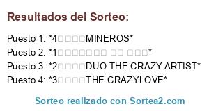 Lista de participantes: *1️⃣❇️ꀷꀎꂦ ꀷꏂ ꂦꋪꂦ*, *2️⃣❇️DUO THE CRAZY ARTIST*, *3️⃣❇️THE CRAZYLOVE*, *4️⃣❇️MINEROS*.