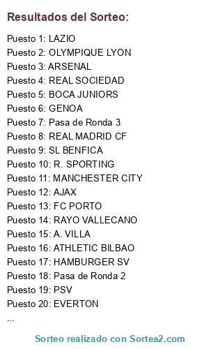 Lista de participantes: A. VILLA, AT. OSASUNA, ATHLETIC BILBAO, ATLETICO MADRID, BOR. DORTMUND, CHELSEA, FC BARCELONA, GETAFE CF, HAMBURGER SV, LEEDS UNITED, LIVERPOOL, MANCHESTER CITY, REAL MADRID CF, SEVILLA FC, SPORTING CP, SPURS, VALENCIA CF, VFB STUTTGART, VFL WOLFSBURG, VILLARREAL CF, AJAX, ARSENAL, AS ROMA, BOCA JUNIORS, EVERTON, FC BAYERN, FC PORTO, FIORENTINA, INTER, JUVENTUS, LAZIO, MANCHESTER UTD, NEWCASTLE UTD, OLYMPIAKOS, R. ZARAGOZA, RAYO VALLECANO, RCD ESPANYOL, REAL SOCIEDAD, UD LAS PALMAS, UDINESE, AC MILAN, BAYER 04, BORDEAUX, FC SCHALKE 04, GALATASARAY SK, GENOA, MALAGA CF, MARSEILLE, NAPOLI, OLYMPIQUE LYON, PANATHINAIKOS, PSG, PSV, R. SPORTING, RC DEPORTIVO, REAL BETIS, SAMPDORIA, SL BENFICA, SUNDERLAND, WERDER BREMEN, Pasa de Ronda 1, Pasa de Ronda 2, Pasa de Ronda 3, Pasa de Ronda 4.