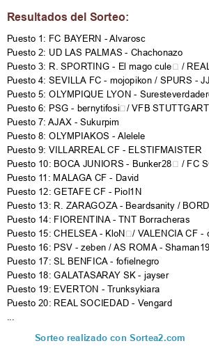 Lista de participantes: GETAFE CF - Piol1N, MALAGA CF - David, LEEDS UNITED - santos, OLYMPIQUE LYON - Suresteverdadero, RCD ESPANYOL - Makabita, SEVILLA FC - mojopikon / SPURS - JJcrack10, REAL BETIS - Sonny / ARSENAL - TATO XD, PSV - zeben / AS ROMA - Shaman1987, R. ZARAGOZA - Beardsanity / BORDEAUX - Rudyset, CHELSEA - KloN / VALENCIA CF - candelus, BOCA JUNIORS - Bunker28 / FC SCHALKE 04 - Clannish, RC DEPORTIVO - aitortxusm / FC PORTO - Droigner, R. SPORTING - El mago cule / REAL MADRID CF - raul_flores, NAPOLI - Maik, PSG - bernytifosi / VFB STUTTGART - Danitelli, A. VILLA - Nigga, NEWCASTLE UTD - Pantic / MANCHESTER UTD - crebocar, UD LAS PALMAS - Chachonazo, VFL WOLFSBURG - IntiPodesta, OLYMPIAKOS - Alelele, UDINESE - tulio, FIORENTINA - TNT Borracheras, REAL SOCIEDAD - Vengard, FC BAYERN - Alvarosc, VILLARREAL CF - ELSTIFMAISTER, RAYO VALLECANO - deilik_buksson, PANATHINAIKOS - Noan, SL BENFICA - fofielnegro, EVERTON - Trunksykiara, AJAX - Sukurpim, LAZIO - caymandg, GALATASARAY SK - jayser.