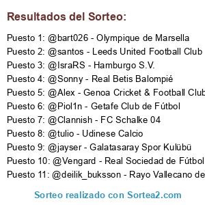 Lista de participantes: @IsraRS - Hamburgo S.V., @santos - Leeds United Football Club, @Clannish - FC Schalke 04, @deilik_buksson - Rayo Vallecano de Madrid, @jayser - Galatasaray Spor Kulübü, @Piol1n - Getafe Club de Fútbol, @Vengard - Real Sociedad de Fútbol, @Sonny - Real Betis Balompié, @bart026 - Olympique de Marsella, @tulio - Udinese Calcio, @Alex - Genoa Cricket & Football Club.