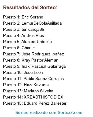 Lista de participantes: Santiago Valero López, Iñaki Pascual Galarraga, Jose Rodriguez Ibañez, Pedro Serrano Fuentes, Juan Hernandez Sanchez, Kevin Miguel Castillo, Ivan Mangas Tejera, Juan Antonio Hernandez, Roberto Frutos, Rudi Alvarez Ramos, Francisco Javier Perez, Alfredo Torres, Iker Muñoz, Joey Akane, Iván Pérez Paredes, Dario Benavides Lombana, Mariano Silveira, Carlos Bueno Freire, Johan Nieto, Moisés Pérez Sampayo, Leo San, Gustavo Ramirez, Abner Bonilla, Jesús Pérez Martínez, Jose L Quintanilla Blanco, Adrián MosFidri Ojeda Torres, Jokin Bengoetxea, Juande JD, Santi Caaveiro Ageitos, Migeru Ikki, Miguel Ángel Rey Gómez, Eduard Perez Ballester, Pablo Saenz Corrales, Dani Gijón, Nestor Barreto Noda, Kray Pastor Aleman, Jorge Pedregosa Valverde, Victor Gonzalez Veliz, Pablo Castañeda, Santi Moreno Ruiz, HazeKazuma, Jose Leon, Eric Sorano, Charlie, KDarkblade2, TheSubzero700, Xavi Farre, LemurDeColaAnillada, Mequins, HuMa OverRated, ULTIM4TEGAM3R PR0, Edgar Quiñones, tunicaroja86, Hasami Age, atermis7, Enrique Montilla Noriega, Andres Rios, Gonzaxel, 303keverson, Hueco Necromorfo, Rafyta18, TheGreatBProject, ItzarMZDZ, G. Pérez, Bruce Wayne, Oliver Fernandez, Ruben Bejerano, Joan Suquet Masó, Txurrito24, juan lozano, Alexislibre, Walter García, sammy sanz, pinkyvic1, AlucardUmbrella, TheWaldo64, inuy05, Julen Yamaha, Santiago Robles, astiyator, threemario, Jorge Alonso, mochu, ToRA z, Rubiopuntoamon, vinizius jou, rampopo, XREADTHISTODIEX, Criss Fresno, srt767, Devland Hayabusa.