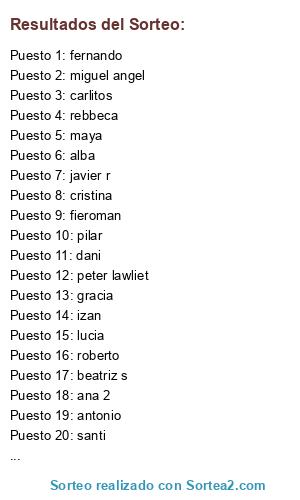 Lista de participantes: alba, ana, ana 2, antonio, aria, beatriz, beatriz s, borja, carlitos, carlos, cristina, dani, fernando, fieroman, gracia, irene, izan, javier, javier r, lucia, maria jesus, maya, miguel angel, peter lawliet, pilar, rebbeca, riley, roberto, santi, sara maria.