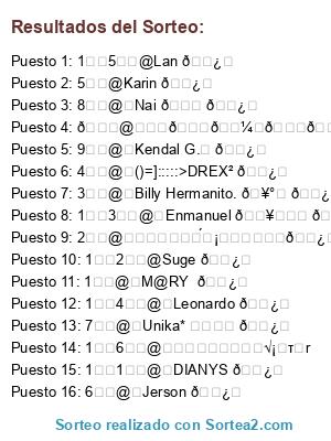 Lista de participantes: 1️⃣@M@RY 🅿️, 2️⃣@✰❣︎ꪜ૯૨ᴏ́ท¡૮ล❀ꨄ︎🅿️, 3️⃣@Billy Hermanito. 🥰 🅿️, 4️⃣@()=]:::::>DREX² 🅿️, 5️⃣@Karin 🅿️, 6️⃣@Jerson 🅿️, 7️⃣@Unika* ❤⚘❤️ 🅿️, 8️⃣@Nai 💞 🅿️, 9️⃣@Kendal G. 🅿️, 🔟@❣︎𝕍𝔼ℝ𝕀𝕋𝕆❣︎ꨄ︎✞︎🅿️, 1️⃣1️⃣@DIANYS 🅿️, 1️⃣2️⃣@Suge 🅿️, 1️⃣3️⃣@Enmanuel 🔥❤️ 🅿️, 1️⃣4️⃣@Leonardo 🅿️, 1️⃣5️⃣@Lan 🅿️, 1️⃣6️⃣@☯︎シ︎ɧนɢಠ√¡૮τಠr.