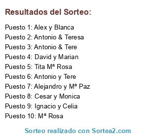 Lista de participantes: Antonio y Tere, Antonio & Tere, Antonio & Teresa, Mª Rosa, Tita Mª Rosa, David y Marian, Alejandro y Mª Paz, Ignacio y Celia, Cesar y Monica, Alex y Blanca.