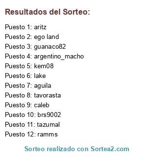 Lista de participantes: lake, tazumal, caleb, ramms, tavorasta, kem08, brs9002, argentino_macho, aritz, guanaco82, aguila, ego land.