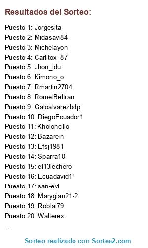 Lista de participantes: Rmartin2704, Efsj1981, Gusgame23, Sparra10, Jhon_idu, el13lechero, Jdlacuadra, Roblai79, Carlitox_87, Zisu05, RomelBeltran, Walterex, DiegoEcuador1, Jorgesita, El_Packman92, Bazarein, Kimono_o, Ecuadavid11, Michelayon, AzulyMillonario, Kholoncillo, Carlosmar_21, Marygian21-2, san-evl, Midasavi84, Galoalvarezbdp.