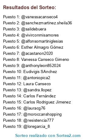 Lista de participantes: Carlos Fernández, Carlos Rodriguez Jimenez, Esther Almagro Gómez, Eudivigis SAnchez, Laura Canseco, Vanessa Canseco Gimeno, @antoniopica2, @anthonyleon852024, @moroccanshopping, @acastanon2020, @resistencia777, @loregarcia_8, @sanchezmartinez.sheila36, @vivirconmisamores, @alfonsomartiniglesias, @salidebuera, @sandra.llopez, @lauracg76, @vanessacanseco4.