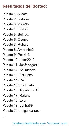 Lista de participantes: Jacob90, Rafana, Luigui carras, Markel, Sefirott, Ruben, Lider2012, Lolazo, Janfribogart, Rafukalp, RIzo, Cortex, Rubale, Exon, Ecua, Fer_1980, Peski13, Peri, Angelcop83, Selinichev, Amatinho2, Roqueluis, Ferrari4567, Fortopeta, Hintoni, penha69, ErRubito, Kamikace, Alicate, Zolio95, Rafarizo, Oseiyo.
