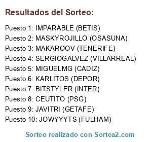 Lista de participantes: KARLITOS (DEPOR), MAKAROOV (TENERIFE), MASKYROJILLO (OSASUNA), MIGUELMG (CADIZ), IMPARABLE (BETIS), JOWYYYTS (FULHAM), CEUTITO (PSG), BITSTYLER (INTER), SERGIOGALVEZ (VILLARREAL), JAVITRI (GETAFE).