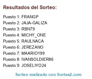 Lista de participantes: FRANGP, MICHY_ONE, JOSELIYO24, RBN79, JAJA-GALIZA, IVANSOLDIER86, JEREZANO, MAARIO199, RAULNACA.