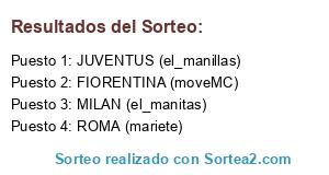 Lista de participantes: ROMA (mariete), MILAN (el_manitas), JUVENTUS (el_manillas), FIORENTINA (moveMC).