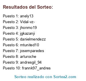 Lista de participantes: danielmendezz, mtunited10, andresgil_94, anely13, Vidal-vz-, jgkazanji, arturoche, jhonmo19, frannk97_andres, josemparedes.