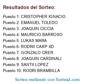 Lista de participantes: GONZALO CRER, JOAQUIN CARDINALI, MAURICIO BARROSO, RODRI BRAMBILLA, CRISTOPHER IGNACIO, LUKAS MARA, EMANUEL TOLEDO, JOAQUIN CICCIA, LOUIS SUBAUSTE, SANTII LOPEZ, RODRII CARP XD.