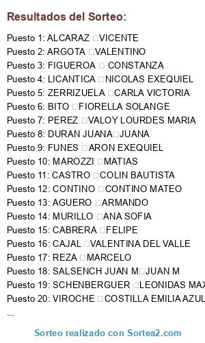 Lista de participantes: PERDIGUERO PERDIGUERO GERARDO, SUPPA MAXIMO, GRAVANO GUILLERMO, GACIOPPO MARIO LISANDRO MARIO LISANDRO, HAUSTEIN, MARTINA, MAROZZI MATIAS, REZA ANA SOFIA ANA SOFIA, JUAREZ SOFIA MORENA, OLIVERA BENECIO, ROMERO SOLANA ELOISA, EGEA DIEGO AGUSTIN, ROJAS LUIS RAMON, CLEMENTE CLEMENTE LUCIANA GISELLE, ESCOBAR IVANA BANESSA IVANA BANESSA, RIVERO RIVERO LEDESMA VALENTINO, BRAVO BRAVO SANTIAGO, REZA MARTIN L, MEDINA CASTILLO MARIANNE DENISE, GETTAR SILVANA, SORIA LUNA FABRICIO, ABACA DIAMBRA ROMINA, FIGUEROA MARCELA DEL VALLE, SILVA AGUSTÍN A AGUSTÍN A, TERRAF MARIANA, FANJUL MARÍA LUCÍA MARÍA LUCÍA, REVERSO ELIZABETH DEL VALLE, LEGARISTI MARTINA, CADENA ANA PAULA ANA PAULA, ALBORNOZ TOMAS AGUSTIN, LUNA MARCOS ALBERTO, CARRASCO SANTINO JESUS, VALENZUELA ALLEGRA JOSEFINA, GRANDI PALOMA, PEREZ BOSIO JOAQUIN, GALINDEZ ESPECHE MAXIMO, FLORES BAUTISTA BAUTISTA, CHICO VIOLA ANDRES GAEL, PICON MARIA SOFIA, CABRERA MATEO, LAMONTANARO LUIGGI LUIGGI, FERNANDEZ MAURICIO F MAURICIO F, CHICO CISTOLA FRANCISCO BALTAZAR CISTOLA FRANCISCO BALTAZAR, VERA VELIZ ALBERTO PATRICIO, HASHIGUCHI CIPOLLA FRANCESCA CIPOLLA FRANCESCA, CARRASCO CARRASCO GASTON, VENDITTI AGUSTINO, ARSLAMIAN BERNARDITA, VALY Eduardo Luis EDUARDO LUIS, CANO MARIA VALERIA, SISA THIAGO JOAQUIN, JUAREZ JOAQUIN JOAQUIN, ROSENDI LUIS BENJAMIN, ALFONSO MARÍA EUGENIA MARÍA EUGENIA, CARRIZO THIAGO, DIAZ SARAVIA MANUELA, LUCENA SOL, PAZ GLADYS VERONICA, LUNA MARIANA YENNIS, GARROCHO GUADALUPE M, JIMENEZ COLQUE LUZ ARACELI, JORGE ELIAS THIAGO, ADAD LOURDES, IGLESIAS NACY, PORTO BAUTISTA, VALENZUELA WALTER JOSE, GALINDEZ ESPECHE OCTAVIO, MEDICI, NICOLÁS NICOLÁS, PAZ JORGE A JORGE A, DI FILIPPO FILIPPO MAXIMILIANO JESUS, GEREZ MARIA LAURA MARIA LAURA, BALDERRAMA AGUIRRE ELOISA, POLANCO VELIA AGUSTINA, HEREDIA JUAN JUAN, GALLIANO ARREDONDO FELIPE TOMAS ARREDONDO FELIPE TOMAS, NAVARRO MIGUEL AGUSTIN, PALAVECINO NICANOR, JUAREZ AYUDARTE NADIA E, GALVAN MADRID MATEO, MARTONI FRANCO TOMAS, SILVA CRISTIAN EMMANUEL, NIEVA MIGUEL ANGEL, GOMEZ ALVEZ LOURDES V ALVEZ LOURDES V, LOPEZ VAZQUEZ LOPEZ VAZQUEZ SOFIA, SALSENCH PEDRO (H) PEDRO (H), GARCIA SCARSO MARTINA SCARSO MARTINA, GLEMBOCKI CATALINA CATALINA, ARSLAMIAN ANA PAULA, GRAVANO CANDELARIA CANDELARIA, ORTEA ORTEA AGOSTINA, LAZARTE MOEYKENS LIBERTAD, CARRIZO MIRANDA MARIA VALENTINA, SALSENCH IGNACIO IGNACIO, ORTEGA SOFIA, PILIA CEZZO CHLOE, MARCAIDA MAXIMO, DIAZ MARIA TEREZA, ARGOTA VALENTINO, SILVA LAUTARO GABRIEL, REZA MARCELO, GALLARDO ANTONELLA ANTONELLA, BUNADER, GONZALO GONZALO, RIVERA LUCIANA ROCIO, GRANDI MATILDE, CASTRO COLIN BAUTISTA, FUENSALIDA FACUNDO, SORIA LUNA MARIA LUCIANA, SPECHE CAMILA CAMILA, COCINA DE CHAZAL LAUTARO, CABRIA MICAELA, VIE VALENTINA, HERRERA MILAGROS AGUSTINA, CORREA THOMAS GIOVANNI, GRANEROS RACEDO TIZIANO, MEDICI, ELÍAS ELÍAS, PEREZ DE LA ROSA MARIA FLORENCIA, HASHIGUCHI C IPOLLA ISABELLA C IPOLLA ISABELLA, MARCAIDA GERONIMO, INTILE SANTIAGO, GUZMAN GUZMAN D ELIAS LUCIA, SILVA ROCÍO L, MONJES MARIA PAULA, GALLO GERÓNIMO JOSÉ GERÓNIMO JOSÉ, GONZALEZ PAPI FELIPE, DAVIT MARIA LAURA, INTILE MARCOS (H), LOPEZ RODRIGUEZ LOPEZ RODRIGUEZ BAUTISTA, POLICHE PLIZZO VIOLETA, NUÑEZ CARRILLO JERONIMO, TERRAF JUSTINA JUSTINA, GLEMBOCKY VICENTE, URIA M° JULIETA, ARSLANIAN JUAN GABRIEL, ESPECHE BENJAMIN, MONTESINO ISABELA, LEAL GUILLERMINA, ALVAREZ TREJO WENCESLAO MAXIMO, MOYANO MARIA LILIA, ESPEJO JORGELINA JORGELINA, ALTUVE YANINA PAOLA, ALVARESZ DELFINA, PONCE VALENTINA VALENTINA, NASIF DIP VERONICA DIP VERONICA, HASHIGUCHI CIPOLLA GIULIANA, BARRAUD EMA, ZALDUENDO JAVIER, DIAZ SILVA JUAN MARTIN, POLITI AGUSTINA AGUSTINA, CABRIA SERGIO LUIS, LOPEZ LUCAS ADRIAN, FANJUL CONSUELO MARÍA CONSUELO MARÍA, LAMONTANARO REGINA REGINA, VERA VELIZ EVA SOFIA, RODRIGUEZ PAZ JOSEFINA, GARROCHO MICAELA E, PUIG CAÑETE MARTINA, ROJAS WDOVIAK MATEO, SPECHE FELICIANO, DIAMBRA ANA, ., PEREA GUADALUPE, RODRIGUEZ PAZ VIRGINIA, MARCAIDA FRANCO, ESPECHE LAUTARO, NUÑEZ CARRILLO SOFIA, ASFOURA ALBERTO JULIAN, GRAVANO MAURICIO, SALAZAR ALFONSO LEONEL, DURNA SIMON SIMON, PARRA RISLAN MAXIMO, SORIA JULIETA, PALAVECINO ARIEL, SIVORI DEL CARRIL LUIS GERONIMO, ARGAÑARAZ NAZARENA VALENTINA, QUIROGA QUIROGA CLEMENTE LORENZO, MARTINEZ MARCONI ADRIANA, JUAREZ DARRDO RUBER DARRDO RUBER, BURGOS NESTOR GUSTAVO, GLEMBOCKY MICAELA MICAELA, PEREZ MICAELA MICAELA, ANDRADE P. MAXIMO AGUSTIN P. MAXIMO AGUSTIN, MAROZZI CANDELARIA, CUEZZO FABRICIO, PARRA RISLAN MARIA AGUSTINA RISLAN MARIA AGUSTINA, PALAVECINO MENTEL FLORENCIA MENTEL FLORENCIA, BENEDEK MARIANO NAHUEL, PUIG CAÑETE TOMAS, GALINDEZ RICARDO FERNANDO, BUNADER JUAN M. JUAN M., MARTONI FERNANDO ANIBAL, ROCHA SOL, DIAZ AGOSTINA, MARIA ROXAA JUAREZ, GUZMAN GUZMAN D ELIAS ISABEL, DE LA LA ORDEN RUBÉN, GRAVANO MARIA MARIA, GONZALEZ GONZALEZ MARIA LAURA GONZALEZ MARIA LAURA, LOPEZ CRUZ MARIA VICTORIA, AGUERO GUSTAVO, ZARATE ELISA, DURAN MANUEL IGNACIO MANUEL IGNACIO, HEREDIA VERONICA GABRIELA, MARTIN MARTIN JUAN CRUZ, CHAPARRO ERNESTINA, OLMOS JULIO LORENZO JULIO LORENZO, MEDINA ESCOBAR BRIZA ABIGAIL, JUAREZ HARO FRANCO NICOLÁS HARO FRANCO NICOLÁS, FERNANDEZ FERNANDEZ NELIDA ELENA, PEREZ HEREDIA LARA MARGARRITA, BALDERRAMA AGUIRRE MAXIMO, PICON LUCAS LUCAS, ARGOTA BENICIO, VERA VELIZ PEDRO AGUSTIN, DULOR GARLATI ENEAS LUCIANO, CABRIA NICAY MAXIMO NICAY MAXIMO, CARRIZO SANTIAGO, CHICO CISTOLA JUAN MARTIN, LUNA MICAELA, PEREZ IARA DE LOS MILAGROS, JUARES MEDINA FATIMA AILEN, GARLATI PRISCILIA MARIA PRISCILIA MARIA, SALVATIERRA CANDELA ANAHI, RUIZ DANEGGER MARIA LAURA, PACHECO LEANDRO AUGUSTO, CARDOZO JULIETA JULIETA, MAZZONE AFRO BRUNO, GARCIA DIAZ SOFIA, REYES FABIANA MARIELA, TARCHINI GARCIA MARIA GUADALUPE GARCIA MARIA GUADALUPE, PICON EZEQUIEL, MARTONI FRANCO DIEGO, CORREAAILEN AGOSTINA, NAVARRO GUADALUPE, POLITI BRUNO, AGUERO MAXIMO A, BERNEDO BERNEDO GONZALEZ MORENA, CAMPANINI LUCIANO, SUPPA JULIAN, LOPEZ ESTIGARRIBIA FACUNDO NAHUEL ESTIGARRIBIA FACUNDO NAHUEL, GALLARDO GAMBETTA M° DEL MILAGRO GAMBETTA M° DEL MILAGRO, GALVAN