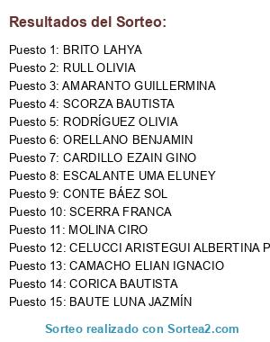 Lista de participantes: AMARANTO GUILLERMINA, BARGERO LACCO ÁNGELES FRANCHESCA, BAUTE LUNA JAZMÍN, BENITEZ ISMAEL, BRITO LAHYA, CADARS FRANCO, CAMACHO ELIAN IGNACIO, CARDILLO EZAIN GINO, CELUCCI ARISTEGUI ALBERTINA PÍA, CLEMENTE SARA, CONTE BÁEZ SOL, CORICA BAUTISTA, ESCALANTE UMA ELUNEY, GIMENEZ VITTO FRANCISCO, MOLINA CIRO, MOYANO CONSTANZA, ORDOÑEZ GENARO VALENTÍN, ORELLANO BENJAMIN, PALAVECINO MARECO ISABELLA, PEREZ BENICIO, PORTELA BRUNA, RODRÍGUEZ OLIVIA, RULL OLIVIA, SCERRA FRANCA, SCORZA BAUTISTA.