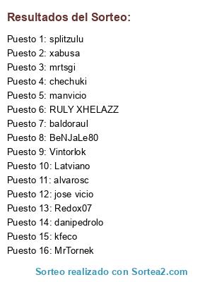 Lista de participantes: Redox07, MrTornek, alvarosc, jose vicio, manvicio, splitzulu, Latviano, xabusa, chechuki, RULY XHELAZZ, danipedrolo, kfeco, BeNJaLe80, Vintorlok, mrtsgi, baldoraul.