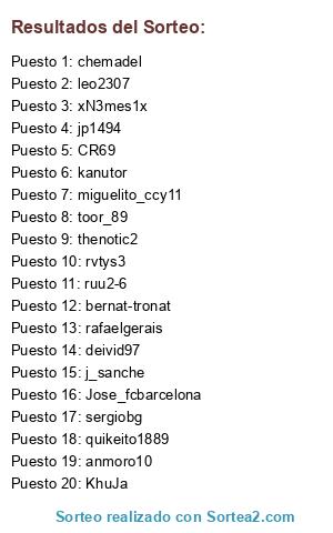 Lista de participantes: toor_89, leo2307, rvtys3, kanutor, miguelito_ccy11, Jose_fcbarcelona, xN3mes1x, jp1494, thenotic2, quikeito1889, deivid97, j_sanche, ruu2-6, KhuJa, sergiobg, CR69, rafaelgerais, anmoro10, bernat-tronat, chemadel.