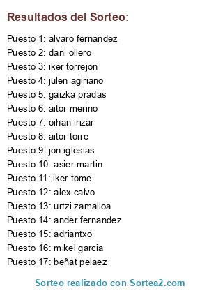 Lista de participantes: aitor torre, jon iglesias, beñat pelaez, alex calvo, oihan irizar, ander fernandez, alvaro fernandez, gaizka pradas, urtzi zamalloa, iker tome, iker torrejon, aitor merino, adriantxo, julen agiriano, asier martin, mikel garcia, dani ollero.
