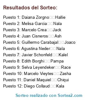 Lista de participantes: Marcelo Vieytes Zasha, Guillermo Carabajal Joaco, Agustina Neder Nala, Javier Schonfeld Kalel, Daiana Zorgno Hallie, Selva Leyendeker Race, Edith Borghi Pampa, Diego Collaud Kala, Daniel Maquiel Chiqui, Melisa Garcia Nala, Marcelo Crea Jack, Juan Cisneros Ash.