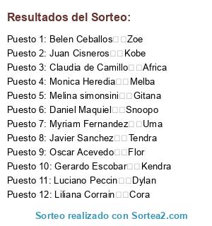 Lista de participantes: Melina simonsini Gitana, Luciano Peccin Dylan, Belen Ceballos Zoe, Javier Sanchez Tendra, Myriam Fernandez Uma, Claudia de Camillo Africa, Juan Cisneros Kobe, Daniel Maquiel Snoopo, Liliana Corrain Cora, Monica Heredia Melba, Oscar Acevedo Flor, Gerardo Escobar Kendra.