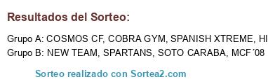Lista de participantes: COSMOS CF, SPARTANS, COBRA GYM, SOTO CARABA, MCF´08, SPANISH XTREME, NEW TEAM, HISPANICOS.