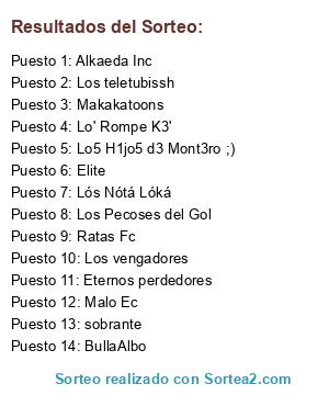 Lista de participantes: Lós Nótá Lóká, Ratas Fc, Los Pecoses del Gol, Alkaeda Inc, Eternos perdedores, Lo5 H1jo5 d3 Mont3ro ;), BullaAlbo, Lo' Rompe K3', Makakatoons, Elite, Malo Ec, Los teletubissh, Los vengadores, sobrante.