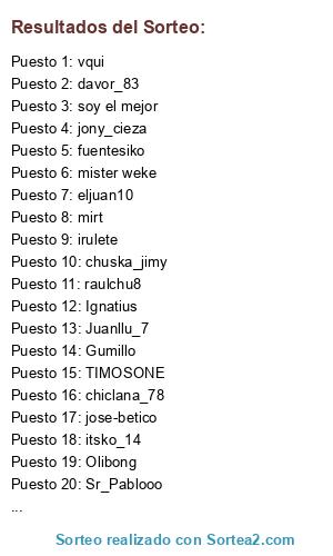 Lista de participantes: JBV13, _-CaTa-_, _valin_, adrianGAR, Adriano-PES, adry_talega, Agu_CWM, Albert0, albertoagl, ALEIX456, AlexZap!, Alpi, Anikilator, Aniquilador, antoniobetico, bola15, brollon_21, Bruno10, camino88, CAPITAN_SALAMI81, cazalla, cesarotor, Ceuti10, chemodemes, chicharou, chiclana_78, chuska_jimy, CR_JUANMA, cristian_hospi, d4v1d_f3n1x, davor_83, delcampo21, donmik, egidopau, eirabella777, eL_SacRiis.., elfiera_bayer, eljuan10, elmaty94, elnegrodezaire, ermaki-10, fidel97, Frankcisco5, fuentesiko, gaditano22, garraponi, gullo_2107, Gumillo, HuangCho, ICG14, IGNACIIO94, Ignatius, ikerpes, irulete, itsko_14, javi_hospiii, javitin79, jimeninho84, joanfcb, jony_cieza, jordigonzalez, Josao25, jose-betico, jsnegro, juanblaky, juanhebr, Juanllu_7, JuanMedina21, kaisser666, KaOs_TY, Kevaceo, kikoyeah, Koren, kuiri, kurry82, LoLiKko, lucas-claudyo, lumpa7, mago, makinaa001, markosalcoy, MeeLLii5, messi_rober, migue_pm, miguelynho69, mirt, mister weke, monsterinho, Mora_9, mordysk, nacholuka, Olibong, oskar16, P0RTILL0, pablito55gol, pablo_brihuega, paiporta, palillo_10, PAU_24, Pixurro2, poletinho10, polmastermil, popoy, potrigol, proberto91, Puertas80, rafa_77, raulchu8, rayoforte, Robe1994MB, Rocky_navarro_94, rojo2, ROLHy, rsalanova, rubale, sbusq, ScOrP1oN, serginho94, sergini11, serrano85, sete_jaen, Sforito24, sidius15, SotoPucela, soy el mejor, Sr_Pablooo, struker28, supercesar75, TIMOSONE, tlusez, ulises, vicente_el_mas, vqui, xatuxixon, XKORPION SEC-PRO, xsatisfecho21, yeraybdn, ylihada.