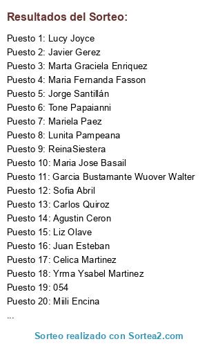 Lista de participantes: 054(2 participaciones), Nahuel Zuccoli, Miili Encina, Yrma Ysabel Martinez, Gastón Verdún(3 participaciones), Javier Gerez, Garcia Bustamante Wuover Walter, Marta Graciela Enriquez, Kira Ibañez, Fedde RO Mero, Daniel CubaTorres(2 participaciones), Laureano Varela, Laa Shummy, Mario Flores, Nanny Pereyra, Ita Uchiha, Tone Papaianni, Yuli BeHappy S, Matias Carp, Juan Esteban, Antonio Peña, Sofia Abril, Liliana Guimarey, Mariela Paez, Lunita Pampeana(2 participaciones), Agustin Ceron(2 participaciones), Mariel Rojas, Lucy Joyce(5 participaciones), Celica Martinez, Maria Laura Padilla Aguirre(2 participaciones), Javier Lubenfeld, Carlos Argañaraz(2 participaciones), Andrea Dominguez, Sara Pereyra, Carolina Marinoni, Rosana Ugarte, Solange Lipcin, Maria Fernanda Fasson, Sofia Abril Quiero, Liz Olave Son, Carlos Quiroz(2 participaciones), Laura Florencia Ojeda(3 participaciones), Jorge Santillán(3 participaciones), Maria Jose Basail(3 participaciones), Liz Olave, Fernando Marcyniuk(2 participaciones), ReinaSiestera(2 participaciones).