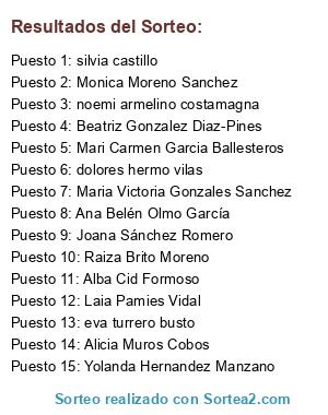 Lista de participantes: Josefa Cobacho Castillejo, Mari carmen maroto, isabel martinez marin, Luis Fuente Mendoza, jaime cifuentes fernandez, Alberto Pozo Castillo, José Ignacio Santos Arranz, Héctor Nuñez Vilaboa, Rocio Garrido Garcia, MARIA TERESA ROMERO SANCHEZ, Carmen Garcia Perez, Nuria Velez Rabasso, Aurora Cuesta Valle, maite terol cintas, Trinidad Casares Pardo, marta morales lopez, Maria Remedios Martin Perez, Rosana lopez rodriguez, SusanA gUIXOT CABRERA, Joana Sánchez Romero, ascension navarro gonzalez, ana saavedra hernández, MOnica Harpigny Latorre, eva costals cervera, veronica marco sanchez, eduardo benito gonzalez, Gema Serradilla Muñoz, Paqui Berengurer Albero, Ana Hita Sánchez, marisa alvarado notario, amparo garcia nicolas, Rafael Lopez Ruiz, Antonia Jimenez Villafruela, macarena medina cala, Esther Jimenez Carrillo, Mar Ostos Pérez, PATRICIA FERNÁNDEZ VILLARES, verónica Muñoz Gutiérrez, RAFAEL LOPEZ RODRIGUEZ, mariola hidalgo, María Isabel Herrero Cantudo, María Jesús Pérez del Postigo Blanco, Maria Jesús Coronado Moya, Raquel Escobar, Anabel Polanco Salas, marta valverde talavera, Rafael Araujo Asensio, Silvia Ramírez Bárcenas, Patricia Fernández Verá, Eva Maria Pérez-Aranda Cabanas, vte belenguer, RAQUEL PATIÑO CHACON, Maria Victoria Gonzales Sanchez, nuria granger Vicente, Maye San frutos Villanueva, Isabel Pablo Simon, Gloria Muñoz chaves, Maria Dolores Pavon Ruiz, Carmen Nicolas Garcia, Milagros Alía, Olga Fernandez elene, Ana Santamaria Pardo, Alba Herranz Diaz-Mayordomo, Ana Meso Pertusa, Purificacion Vilaso Millán, Teresa Pozo Sanchez, julian almenara mendez, Víctor Garcia Asenjo, silvia van litsenburgh garcia, Mayte Garcia Perez, mario fernandez luna, Rosa Murcia ballester, maria jose maestre redondo, Carmen Arocha Martos, cristina hernando, Sara Jimenez Llorente, Ester Fdez, natalia velasco, miriam vallejos gonzalez, SUSANA GIL, Lola Muñoz, Alberto Iniesta Ortuño, macarena gallego jimenez, Ainara Cambero Sedano, gloria revuelta Escuté, Sandra Delgado Martinez, Yolanda Mancilla López, Mª ELENA MARTÍN FERNÁNDEZ, Belen Lopez Velasco, estrella villagran cabello, susana del castillo gonzalo, Almudena Ayuso Mora, Africa Garcia Torres, Antonio Arias Guerra, ana fernandez fernandez, jose A. Gonzalez Sifres, almudena blanco perez, Encarna Esteban Cánovas, María Martín cerrato, pepi Fernández Almiger, Davinia HERNANDEZ, Encarna Hernández Pérez, Andrea Graña Martínez, Maria Gabriela Rodriguez Pazos, Dora Martinez, Francisco Gonzalez Sofio, Rosmari Garcia Escobar, INES SUAREZ RODRIGUEZ, susana galan arribas, Vanessa Segura Hidalgo, alicia rivas gama, Laura Calle Cillero, Ana Tienda Sánchez, elena Santos, santiago leon lopez, Maria Fustero Cirisuelo, Pablo Escribano, Carmen Martínez Calzado, Amalia Fornells martínez, PILAR MARIA MONTERO BARAJAS, Maria Luisa Esteo, Macarena Serrano Tarazona, daniel martin perez, Laura Llorca climent, Ana Moreno Lopez, RAQUEL NARES BUENO, Rocío Bueno Montilla, leonardo ortiz lara, Vanesa Gil Iglesias, Marta Villalibre Vicente, cristina casado benitez, ana maria cabello de los cobos hernandez, Carmen Auxiliadora Jiménez Iglesias, silvia franco ortega, Elena Fojón Haro, Rebeca Arcega Utrilla, Mercedes Gonzalez herrero, Allcia Zaragoza Gomis, maria jose peraza mora, Mónica Jorge Hernández, Montse León, M Ángeles Olmedilla Hh, M Carmen Ramos Aragón, elda martin corrales, Monike Fernández Menéndez, Mercedes Prieto Garrido, Inma Santiago Maldonado, Laura García Montes, Beatriz Blázquez García, Blanca López Cortés, María del Carmen López Perera, Patricia Villagran Vargas, cristina bañuelos perez, natividad gomez cordero, MºIsabel Mateo Sánchez, Laura Chamizo Villalba, nazareth luengo sanchez, Remedios Rivera Garcia, María Arconada Ballesteros, Marisol Ferragut Pons, Beatriz Alvarez Fernandez, LAURA MORALES MIRETE, raquel yunta sanchez, Eva Cristina Cabrerizo García, Mari Carmen Garcia Ballesteros, Victoria Clemente González, amanda manzano orduña, rosana escriva, Vicky De la cruz calvo, antonia estupiñan artiles, Maria Jose Garcia Ordiñana, María Paz Pantrigo Mansilla, Ana Adrover Baz, Monica Gomez Santiuste, sarah prats ferrer, Agustín Piñero Tomás, DAVINIA CARNICERO POZO, Noemí Gil Albalat, Lourdes Dìaz, Elva Maria Rouco Pérez, Mamen Caño Delgado, Natalia Ruiz Acebo, Lorena Soto Almagro, laura dasi badia, Yoli Pablos Parejo, carolina cañizares martin, Eulalia Mª Carreras Garcia, Paloma Alvarez Gonzalez, cristina Page, Diego Tizón Freiría, Alfonso Rojas Vivas, sonia jimenez giron, Carmen López Galeano, maria del prado martin sanchez-rico, Attma Castaño Silva, silvia millan martinez, Elena Ruiz Olivares, ANA MARIA BARBA SANTAMARIA, vicenta gallego piris, Agustina Marrero Mateo, Antonio Alcaina Serrano, NOELIA FUENTES CALLE, maria ferrero miguel, José Ignacio Señán Cano, Lucia Galindo Lopez, Marcos González roca, Marina Smirnova, Laura De mora garcia, david lopez sastre, teresa pedrero barroso, Cristina Patiño Chacón, Paco Martin montero, montse aguado herrador, Alicia Fernández Moral, sergio martin jimenez, Amaya Barrena Vilas, Mónica Burgos Blasco, Patricia Ruiz simon, Silvia Zapata Basty, Yolanda Pelaz Díez, Esther Arrabal sanchez, Trinidad Molina Ruiz, Noely Castaño, lorena Bustos jorquera, Isabel Espeso de Godos, Ana Zaragozá López, Susana Espín Torres, ana maria martin montero, Berta Sebastian Senin, margarita rodriguez rubio, Jocelyn Andrea Cid Muñoz, erica aloe, Anitry Saldaña Hernández, Arancha Torres Solares, Carolina Peña, Maria del carmen ruiz alvarez, Beatriz Diaz Murillo, Alicia Ruiz Rodríguez, julia sánchez, Altamira Antolín Martinez, maria-pilar falco-correas, Cristina Tablado Gilabert, Lorena Fernandez, esther romaguera prieto, Gema Barón Dulce, Violeta López Rodríguez, maria eugenia martinez perez, Alba Rubio Perez, Nuria Vidal Lliberós, Maria Victoria Argüelles Pérez, sara nuñez menacho, BEGOÑA MONDEJAR VIÑUELAS, Lau