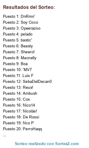 Lista de participantes: Tasipa, Nicolás!, PerroHaqq, rz, Reus!, Ambush, pelado, C14, DnRmn', 'MV7, Opeerazoo, Benji Price, Boa, Luis F, Macnelly, Jim, Cox, SebaDelDecan0, gces, EddieDick, Soy Coco, Valpo, bastic', Mandzukic/MM17, Sheero!, av/alonso, Nico14, ToMisaki, Beasty, Oliver Atom, De Rossi, Nco P.