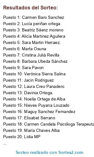 Lista de participantes: Miguel Orellana Gamez , Mari Angeles Morales Márquez , Maria Carmen Piñero Fernánde, Lucía periñan ortega, Patri Aguilar Ruiz. , Sole Ortiz Rosa , Elisabet Serrano, Verónica Sierra Salina , Rocio Sanchez , Fany Martinez Lainez , Cristina Ortega O'Dogherty, Cristina Soto acevedo , Beatriz Sáenz moreno, Esther Astorga Reyes , Elena García Coto, Helena De Troya , Zoraida Martinez Torrejon , Irene Sanchez , Lucía Leal , Guadalupe de Alba Aragón, Eugenia Delgado , Carmela Amaya Magallanes, Cristina Juliá Revilla , Belén Molina , M. Victoria Alcaide , Noelia Ortega de Alba , Abigail Gonzalez Verdugo , Elena Lema Gomez , Laura Aparicio , Cristina Quintana Moya , Mónica Muñoz Ruiz , Aima Menchen , Elena Rodrigo Hernández , Paqui Delgado Ruiz., Almudena Chaves jimenez. , Elena Cañete , Omayra Ortuño Casas , María Dolores Cantero Tardío , Sara Pavon , Alba Gonzalez Martin , Lidia MP , juliana pardo campoy. , Rosa López Rodríguez , Jorge Fornell Sanchez , Carmen Candela Psicóloga Terapeuta, Macarena Carrasco Rodriguez , Luis Ney Valera Brito , Juana Avila , Mercedes Gómez Nájar , Elisabeth Guerrero Zarzuela , Ana Belen Muñoz, Marina Duran Gomez , Patri García Guerrero , Eva Maria Alba. , Raquel Carrillo Alonso , Yolanda Flores Gallardo , Sandra Muñoz de Escalona, , Guria Elu López , Marta Ruiz Ariza, Elvira Perejón Díaz , Sabela Capitán , Noelia Vela Galiano , Manuela Paradela Periñan, Manuela Leal Ruiz , María Almeida Pérez , Silvia Sanchez Aragon , Teresa Crespo Rodríguez , María Chaves Alba , Begoña Caro zajara , Marijose de la Iglesia , Elsa Galdon Heredia , Ana Macias Montero , Patri Martínez Garrido. , Victoria Aragon Tocino , Amparo Quijada Barcia , Patricia Ibarrondo , Juan Alfonso Benitez , Carmen Baro Sanchez , Carmen Rodriguez Ojeda , Irene Garvel , Carmen Sev , Beatriz Ramírez Sánchez, , Barbara Ubeda Sánchez, Lucia Sanchez Aragon, Jacin Rodriguez , Maguy Sanchez Fernandez , Cristi Lopez Martínez , María Sánchez Cano , Alicia Martinez Aguilera, Marieta Lop Red , Fátima Vela , Maria Herreros , Reyes Sánchez Rizo, M Dolores Reyes Ruiz. , Alba barbera Duelo., Gema Palacios Sanjuán , Patricia Real Rodriguez , Davinia Ortega. , Conchi Marin Moreno , Nadia Castro , Amanda Castaño Jimenez Belen Jimenez, Soto García Virginia , Carmen Baena , Lourdes Ramirez Salado , Belen Tocino Baro , Raquel Rodríguez Varela. , Itziar Guinea Dernour , Macarena Pérez Montilla , Laura Creo Panadero , Olga Delia Rendon Marin , Ana Muñoz Ramirez , Susana Mena Martínez , Maria Dolores Cantero, Laura Rodriguez, Cristina Gordillo Aleu, Miryam Nieto García. , Silvia Fariñas Jiménez, Bertha RV, Sandra Barragán Domínguez. , Cristina De Cozar , Susana Grosso Castillo. , lidia bernal guerrero , Carol Torres Saucedo, Almudena Gomez Macias , Veronica Redondo Gonzalez, Verónica Luisa Pardo Arias, Francesca Zingales , Marta Osuna , Tamara Ruíz Saracho, Janire Ircio de Pedro, Cristina ezcurra, Aurora Fernandez Bernal , Melanie Ruiz Jimenez, Sara Martin Herraez. , Wiam Bekkai, Sandra Sánchez de Gomar, Mari Carmen Peña Gomez , Cristina Fernandez González, Maria Lopez , Cristina Ortiz Marín , Adelaida González Algaba , Lucía de Vega García , Nerea Ortiz Moreno, Irene Fernández Foncilla. , Nieves Puyana Louzado , Laura Guzmán Ramírez, Alejandra Brea Fdez , Maria Belén Hernandez Gonzalez , Cristina Sánchez Rosa , Vanessa Ramos Vargas, Laura Otero, Inma Fernández lopez , Virginia suazo Fernández , Inmaculada Ortega Trujillo , Carmen Oliva Ruiz Díaz , Tamara Diaz Toledo , Maribel Ortiz guerrero, Mari Carmen Cebada, Marilo Moreno Jimenez, Jessica Pastrana, Lidia López García, Verónica Sánchez Carmona, Virginia Aragon.
