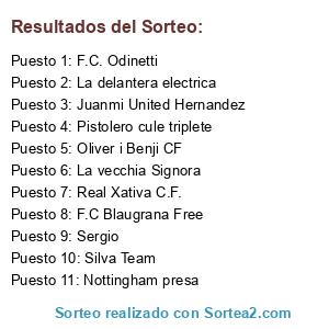 Lista de participantes: Juanmi United Hernandez, Nottingham presa, F.C. Odinetti, La delantera electrica , Pistolero cule triplete, Silva Team, La vecchia Signora, Real Xativa C.F., F.C Blaugrana Free, Oliver i Benji CF, Sergio.