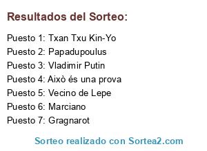 Lista de participantes: Això és una prova (2 participaciones), Papadupoulus (3 participaciones), Vladimir Putin , Txan Txu Kin-Yo , Gragnarot , Vecino de Lepe , Marciano.