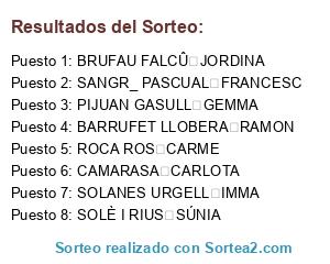 Lista de participantes: ALBIAC VI_OLAS FERRAN, ALC_NTARA RODR_GUEZ N_RIA, ALMENARA MASBERNAT MARIA, ANDREU BARBERA XAVIER, ARGELICH TRICAS ORIOL, ARQU_S BARDAJ_ JORDI, ARQUES BARDAJI GEMMA, ARQUES CURCO ROSA, ARRUFAT GONZ_LEZ RAMON, ARRUFAT VILAMAJ_ FERRAN, ARRUFAT VILAMAJ_ PAU, BADIA BONET JORDI, BAJONA CASES JOSEP, BAJONA CERC_S ORIOL, BAR_ SALVADOR, BARRUFET LLOBERA RAMON, BARRUFET MARTINEZ MARC, BARRUFET SEGARRA ADRI_, BATALLA FOIX ROSA, BERGUA MU_OZ JOSEP, BERTRAN GRAU GEMMA, BERTRAN MARTI ANTONI, BERTRAN SANOU MARIA, BONELL BOSCH ALBERT, BOSCH SALLA RAMON, BRITO CARLOS, BURGU_S SOLANES JOSEP M, CALIMAN CLAUDIO, CAM_ COLOM RAMON, CAMI CORNUDELLA ROGER, CAMI GELONCH MARC, CAMI PALLEROLA MARC, CAMI PALLEROLA MATEU, CAMPILLO BETBES_ MANEL, CAPDEVILA SUBIR_ MARIONA, CAPELL BUENDIA ANTONI, CARDIL JOVE JOEL, CARDIL RIO JORDI, CASADELLA QUER XAVIER, CASTILLO HERNANDEZ MARIA DE LOS ANGELES, CAVA VIL_ JOAN, COROMINA SUYANTI CECILIA, CORRETGE NIUBO PAU, CORRETGER OLIVART JOSEP MARIA, DANCZYSZYN AGNIESZKA, DOLCET CABASES ALBERT, DURAN BAGAN JORDI, DURAN GONZALEZ AVRIL, EGEA IVAN, ENRIC BOSCH, FARRAN JULI_ _NGEL, FARR_ FARRAN IBAN, FREIXES CAPDEVILA N_RIA, FREIXES SORIA S_LVIA, FRESNO AMATE MIGUEL, GABERNET SAGRA MANEL, GALICIA VAL ARANTXA, GALLART ROMERO JOSEP MARIA, GARCIA JIM_NEZ ABEL, GARC_A JIMENEZ NIKO, GARCIA JIMENEZ TONI, GARCIA SERRATE _SCAR, GELONCH NICOLAS JOAN, GELONCH QUER JAN, GELONCH SANCHEZ LIDIA, GILI MASAGU_ NEUS, GOMEZ LOZANO MARIO, GOMEZ SARO ROBERTO, GONZALEZ CORTINA OSCAR, GUICH ESCOLANO MIQUEL, GUICH JIMENEZ JAN, GUILLAMET BADORREY LAIA, GUTI_RREZ RIU XAVI, HERRERA FARRERES GERARD, IBARS PEIR_ ALBERT, ISTOC MIHAELA, JIMENEZ SALMERON RAQUEL, JOFRE BA_ERES XAVIER, JULI_N ESTITXU, LAHUERTA REIG JORDI, LLAD_S CATAL_ ELISA, LLAURAD_ PAJARES ENRIC, LLOBERA SANMARTI _LVARO, MAGALLON CORTADA MONTSERRAT, MALDONADO RABES GABRIEL, MARQUES RODES JOSEP MARIA, MARQUES VILARDELL ORIOL, MART_ GONZ_LEZ MARC, MART_ GONZ_LEZ JAUME, MARTINEZ MARTINEZ KARMEN, MARTINEZ MARTINEZ YOLANDA, MIHAES GEOVANINA, MIRET BERROCAL JORDI, MOR TRIQUELL ANNA, MORENO CAPDEVILA ORIOL, MORILLAS SANCHEZ JORGE, MUNNE ARGELICH BIEL, NAT_LIA BERNAT, NAVEED HAMZA, NICOLAS GELONCH MAGDA, NICOLAU INGLES JORDI, NUNES JORDAN SERGI, PALACIOS PEREZ IGNASI, PALAZON BERMEJO JORDI, PALL_S JAN_S JOAN, PALLEJA FIGUERAS LAURA, PAU ABELLA XAVIER, PEIRET DE LA FUENTE CARLES, PEIR_ CASES MONTSE, PEIR_ CORT_S NEUS, PEREZ LLENA SERGIO, PUIG JIMENEZ MONTSE, PUIG RUBIES JOSEP, QUERALT MATEU ROSER, QUINTANA GARC_A LAURA, RALUY DAVID, RAMIREZ VAYA ANGEL, RE_E BELLMUNT BERNAT, REQUESENS RODR_GUEZ RAMON, REQUESENS TORRELLAS RAMON, ROCA HEREDIA ALBERT, RODRIGUEZ HERRERA PACO, ROSELL_ AIXAL_ RAMON, ROSINACH TRIQUELL GERARD, ROURE BEA ALBA, ROURE SANVICEN ALBERT, SALLA GONZ_LEZ JOSEP, SALVADOR ROBERT JOAN, SALVIA SOLEDA JOSEP M_, SANCHEZ ORREGO GUSTAVO, SANCHEZ SANTIVERI ANGELS, SANGR_ CASALS ANNA, SANGR_ PASCUAL FRANCESC, SANTANDREU BERTRAN ROC, SANTANDREU ROMERO N_RIA, SANTANDREU ROMERO JUAN, SANZ MARTIN GILBERT, SEMENTE MIRET JOSEP RAMON, SERRA VILA JORDI, SERRES GONZALEZ CARME, SIRVENT QUEROL BIEL, SIRVENT SOL_ JOAN, SOPORAN IOAN, SORLI FOIX OSCAR, SU_REZ IVAN, TARRIO CARULLA ROBERT, TEIXID_ PAU MARC, TERRATS PIJUAN GEMMA, TORRES MESTRE ANTONI, VALL_S BE_ JORDI, VALL_S BE_ ANTONI, VEGA BLESA ALEX, VILA ARQUES JULIA, VILA CA_ELLAS ENRIC, VILAMAJ_ MINGUELLA MARIA MERC_, VILLUENDAS SANDRA, VILLUENDAS JOSE ANTONIO, XUCL_ NOGU_ JOVITA, ZAPATER PUNTOS ANDR_S, ZARAGOZA BENDICHO JORDIREÒE JOVE PEPITA, ALSINA AUBACH XAVI, ALSINA LAMARCA JANA, ALSINA LAMARCA PAULA, ANTONIJUAN MATEU RAMONA, BADORREY GOMICIA SUSANA, BARRASA D…U ISONA, BARRERO PAQUICO JOSE MANUEL, BARRUFET ROSINACH ANGELS, BARRULL ANTONIO, BAU PERARNAU SANDRA, BERTOSSI DIVORRA FIORE, BERTRAN RIUS ANTONIO, BESORA ARDIACA JUDITH, BLANCH DOLCET ISABEL, BLANCH DOLCET RAMON, BONEU BONET SANDRA, BOSCH SALLA ANNA, BOSCH SARDAÒONS ANTONIETA, BRUFAU FALCÛ JORDINA, BUIRA BOIRA MARIA, BUIRA RUBIO RAMONA, CAB⁄S BARRUFET DOLORS, CALAVERA RODELLAR MARIA JESUS, CAMARASA CARLOTA, CAMATS I SOLÈ JOSEP, CAMATS I SOLÈ AINA, CAMATS I SOLE JUDIT, CAMÕ PONS JOSEP, CAPDEVILA ESPASA ANTONIETA, CASES VIDAL MARIA ELENA, CASTELL” RIBELLES ERIKA, CASTILLO PI—OL VICENTA, CAVA MARTÌ GEMMA, CERC”S FARR¿S ANNA, CLOTA TOM… ABRIL, CODINA HUGUET TERESA TERESA, CORRETGÈ OLIVART MARIA ROSA, CORTES FLIX ANNA, CORTES FLIX ESTER, CUNILLERA MIRÛ MERITXELL, D…U BARRUFET AURORA, DIVORRA MONTAÒA GEMMA, DOMINGO CORNUDELLA MERCE, ECHEVARRIA BOTANCH JANET, ESPASA GALCERAN FERRAN, ESTEVE TIRADO JOSEP, FARRÈ MONTEGUT ANNA, FARRE SALLA RAMON, FERRER RODI… TONI, FERRERA CH¡VEZ DAVID, FUSTA SOLSONA FRANCISCO, FUSTA SOLSONA CARLES, GALLART ROSINACH MARIA, GARCÌA MARIA CARME, GARCIA PELLICER JORDINA, GAYA SANS SEBESTIA, GELONCH LLOVERA NOEMI, GELONCH NICOLAS ANNA, GELONCH QUER ARES, GELONCH ROSINACH OLGA, GENE GRANADOS AINA, GILI GORGUES ANNA MARIA, GRAU SALLA CONCEPCI”, GRAU SALLA TERESA, GUEMBE ELÕAS ANNA, GUICH JIMENEZ ¿XEL, GUILLAMET SANTANDREU ALBERT, HERNANDEZ BONET VANESSA, HIDALGO PIÒOL ELI, INGLADA FITÛ MIREIA, LAHUERTA MOLGO AINA, LAMARCA SANTADREU EVA, LARRUY MIRANDA MARTA, LLORENS QUER LLUISA, LOPEZ CASTILLO JOSSE LUIS, LUNA GOMEZ MONTSERRAT, MALLABRERA RODRIGUEZ CARLES, MARCH HOSPITAL CLARA, MARCH JUANMARTI MIRIAM, MARTIN ESPINOSA LUCIA, MARTIN GARCIA DAVID, MARTIN GILI LAIA, MARTIN TORRUELLA FRANCESC, MARTINEZ ANTONIO, MARTINEZ CAPDEVILA PILAR, MAS IZQUIERDO ANNABEL, MAS URGELL M™ TERESA, MASANA GAYA TERESINA, MATEU IZQUIERDO SANDRA, MATEU IZQUIERDO CRITINA, MATEUS BONET GAL.LA, MEDA BALLESTE ROSA MA, MINGUET FALC” JOSEP M™, MIR BENET JORDI, MIRÛ VIL‡ MERCË, MOLES TORRENT ASSUMPCIO, MONTEGUT SALLA YOLANDA, MORENO BORONAT ALBERT, MORENO LINDES CARME, MORENO TALARN MARC, MOTLLÛ CAELLES MARTA, M¸LLER ULI, NAVAS BARRUFET MARIBEL, NEL.LA ARMENGOL PRATS, NICOLAS GELONCH JORDI, NI—¡ NAV…S MIREYA, OJEA JIMENEZ ELISABET, OLIVART FARRÈ SALVADOR, OLIVART I MOR LAURA, OLIVART TORREN