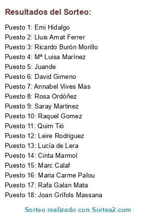 Lista de participantes: Abel Oduro, Achoijak El Oualad, Ada Monleón Lopez, Adolf Bargués, Adrià Herrada Massa, Adrian Carretero Arribas, Adriancarreteroarribas, Adrinay@, Agustí Sanchez Perez, Aida Ordoñez, Ainhoa Del Pozo, Ainhoa López Achalandabaso, Alba Garcia Nieto, Albert Mariné Mestres, Albert Pastallé Nogué, Albert Roig de Moya, Alberto Perez, Alexandra Ciont, Ana Arias, Ana Castillero, Ana Colom Jurado, Ana López, Ana Mª Teixidor, Ana Marban, Ana Maria Valero Gutierrez, Ana Sabe Marín, Ana Toledano, Ana(ana_garcoll), Anabel Nolla Ortega, Andrea Criado, Andres Moran, Andres Rueda, Ángel Millán Cámara, Angela Mª Perelló Montaner, Àngels Batlle, Anna Caballero Alonso, Anna Cardo, Anna Maria Martín, Anna Pardo, Anna Rovira, Anna Sanchez Carafí, Anna Vas, Annabel Vives Mas, annaguapa@, Antoni Capellades Parellada, Antoni Foza Mercader, Antonio Gomez, Antonio Jimenez Ruiz, Antonlina Manga, Araceli Nieto, Arnau Giribert Sanjuan, Belén Álvarez Bravo, Bruno Hernández, Carla González Rodríguez, Carme Martín Henares, Carmen (maxvictor2008), Carmen Fuertes Alba, Carmen Sanchez Olle, Carolina Hernandez, Carolina Herrero Gil, Christian Navarro Garrido, Cinta Marmol, Claudia Alcácer, Claudia Elisabeta Simón, Clàudia Munné, Coral, Cristina, Cristina (cbmtati), Cristina Díaz, Cristina Gomez, Cristina Màrquez, Cristina Morales, Cristina Peñalvert, Cristina Rios, Cristina Tobella, David (sorianopinazo), David Contreras Borbalàs, David Gimeno, David Jimenez, David Reche, Debora Llamas, Dolores Sanchez Soto, Dolors Martínez, Dory López, Elena Grisolia, Eliam Graell Guerrero, Elisabet (salenchuky), Elisabet Fernandez, Eloy, Emi Hidalgo, Emilio Serrano Canales, Emma, Encarna Sánchez Haro, Enric Morral, Enriqueta Arenas, Erik Villca Rodriguez, Esmeralda Garrido, Esmeralda Rodriguez Botella, Esperanza Alfaro, Estela Garcia, Esteve Gonzalez soria, Esteve Pujolà, Esther Sánchez, Esther Trenard Martín, Eugènia Vergés Vidal, Eva Carmona Reifs, Eva Castaño Garrido, Eva Fontiverio García-Izquierdo, Eva Lafuente, Evaristo Jornet Perez, Francesc Ramon Hielga, Francesc Sorribas, Gema González Carrasco, Gemma Escudero Sola, Gemma Fuentes, Gemma Jiménez, Gemma Poch, Gemma Siscar, Glòria Gomez Cervelló, Gwyneth Cantos Peralta, Helena Catasús Martínez, Ignacio Rodriguez, Imma Clarens, Imma Quintala Blazo, Inma Fructuoso Vila, Iris Iglesias, Iris Suárez Vélez, Ivan Contreras, Jaime Gadea París, Jamal Slimati, Jaume Andres Galofre, Jaume Encinas, Jaume Valls Corsellas, Javier Gómez Pérez, Javier Lucena, Javier Santos Crespillo, Jessica Canals, Jessica Más Rodríguez, Jessica Molina, Joan Bermejo Hita, Joan Bou i Garrido, Joan Carles Garcia Navarro, Joan Giribert, Joan Grífols Massana, Joan Jorba, Joan Larios Beltrán, Joan Navarro, Joan Porta Puig, Joana Carmona, Jordi Amote, Jordi Díaz Nivera, Jordi Edo, Jordi González Pedrosa, Jordi Gutierrez, Jordi Molina Rueda, Jordi Parera, Jordi Perez, Jordi Pons Badenes, Jordi Porta, Jordi Sousa Roca, Jordi Vidiella, José A. Naranjo Villalobos, Jose Antonio Martin Rodriguez, Jose García de las Bayonas M., José Luís Garcia, Jose Mª Merchan Alvarez, Jose Sala Zamudio, Josefina Lladó, Josep Alemany, Josep Casanovas, Josep Fabra, Josep Pardo, Josep Puerta, Juan (juanfu1), Juan de Dios Rodriguez, Juan José Perez, Juan José Sánchez Ramírez, Juan Zamudio Vargas, Juana Cuartero Navarro, Juana Membrado, Juande, Juani Baixllobregat, Judit Colell, Judith Coca Salinas, Judith Galindo, Júlia Arcas Martinez, Julia Arrabal, kasia Sampolska, Laia (laia.22-prieto-munte), Laia Casals, Laia Sisteró, Lara Camacho, Laura Duro, Laura Jiménez, Leila, Leire Rodriguez, Leonor Seco Artola, Leticia Macias Jurdo, Lidia Bou, Lidia Calzada Gabaldà, Lidia Nicolás, Liliana Morales, Llorenç Guich Puig, Lluc Basora Pascual, Lluis (luisgp65), Lluis Amat Ferrer, Lluis Cintas, Lluis Encinas, Lluna Pérez Sánchez, Lorena Zuferri, Lourdes, Lucía de Lera, Lucía García Millán, Luis Ignacio Senra Sexto, Luisa Nogués Benaiges, Lupe Almirall, Mª Antonia Fontiverio García-Izquierdo, Mª Carmen Cabrera Villar, Mª Carmen Crespo, Mª Carmen Expósito, Mª Carmen López, Mª Dolores Sigueiro Mora, Mª Jesús González, Mª Jesús Juan Figueras, Mª José Ramirez Garcia, Mª Luisa Marínez, Mª Pilar Rais Rodríguez, Magda Rodriguez Rivamar, Maite Bargues, Maite Coma, Maite Ramon, Manuel Ropero, Mar Salinas, Marc Calaf, Marc Dalmau, Marc Ribes Garcia, Marc Vinaixa Garcia, Marcela Celia, Mari Angeles Salvador Badia, Mari Angels Puig, Mari Lopez, Mari Luz Moreno, Mari Sorribas, Maria Angeles Rodriguez, Maria Carme Palou, Maria Dolors, Maria Dolors González, Maria Garrón, Maria Josep, María Martínez, Maria Rosa, Maria Rosa Matas, Maria Sabroso, Maria Teresa Arraez, Maria Teresa Perera, Marina Gutierrez Lopez, Marina Riu, Marina Rueda Jimenez, Marina Tella Amo, Mario Javier Hurtado Andrade, Mario Muñoz Muñoz, Marisol Linero Gabacha, Marta Campmany Camps, Marta Cerezo Calleja, Marta Fora, Marta Lopez, Marta Peris Fraile, Marta Rovira, Mayte Roque, Mercè Gamisans, Mercè Mora Vidal, Mercè Sanjuan, Mercè Tarrida, Mercedes Millan Teixido, Meritxell Marqués Agustí, Meritxell Pedrosa, Mery Acon, Miguel Angel Aranda Martin, Miguel Angel Rodriguez, Miguel Angel Sanchez, Miguel González, Mila Veliz, Miquel Roca Font, Mireia, Mireia Cano Pistares, Mireia González Rodriguez, Mireia Pérez Perelló, Miriam López Rueda, Miriam Riera Creus, Miriam Tella Terrero, Mirian Lombeida, Monia Freitas, Monica (moni-izas), Mónica Garcia Oliva, Mónica González González, Mónica Llordella Batlle, Mónica López Llopart, Mónica lópez Ruíz, Mónica Navarro Sánchez, Monica Reche, Mónica Vega Santiago, Monika Kratzler, Montse Alvarez Gonzalez, Montse Catasús i Martinez, Montse Esteve González, Montse Latorre Seguer, Montse Llofriu, Montse Llopart, Montse Lopez Rueda, Montse Millán Teixido, Montse Munne Porta, Montse Pujol, Montse Ruiz, Montse Salas Pujo